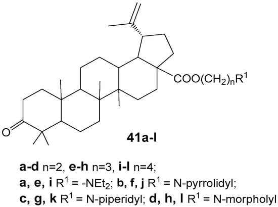 Yang S.-J. et al. reported the synthesis of betulonic acid derivatives 41al and evaluated their in vitro anti-cancer activity against MGC-803, PC3, Bcap-37, A375, and MCF-7 cell lines [44]. The compound exhibiting the highest activity, 41k (Figure 13), demonstrated IC50 values of 3.6, 5.6, 4.2, 7.8, and 5.2 µM on these respective cancer cell lines. Further studies indicated that this hybrid, 41k, induces apoptosis in MGC-803 cells via the mitochondrial intrinsic pathway.