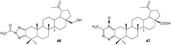 Derivatives of lupanoids containing 1,2,3-triazol and 1,2,4-triazine groups were synthesized and their cytotoxic effects were evaluated against A549, HCT 116, HEp-2, MS, and RD TE32 cancer cell lines. N-acetyltriazole of BE 46 was found to have antiproliferative activity with IC50 values ranging from 2.3 to 7.5 µM against HCT 116, HEp-2, MS, and RD TE32 cell lines. The BA derivative 47 showed activity against HCT 116 and HEp-2 cell lines with IC50 values of 1.4 and 1.5 µM, respectively (Figure 15). Although compound 47 demonstrated higher activity, product 46 is being considered for additional investigation due to its weaker inhibitory effect on normal epithelial cell division [46].