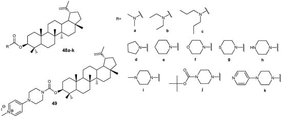 In a series of recently synthesized lupeol-3-carbamates 48ak (Figure 16), compounds 48e,h,i,k were identified, the antiproliferative activity of which (IC50 < 20 µM) towards three tumor cell lines A549, HepG2, MCF-7 significantly exceeded that of the parent lupeol (IC50 > 35 µM). The transformation of conjugate 48k into the salt form 49 led to a significant increase in solubility (0.35 mg/mL) and activity (HepG2, IC50 = 3.13 µM) compared to the parent compound 48k (HepG2, IC50 = 13.98 µM) [47]. According to the preliminary data obtained by the authors of this study, the antitumor effect of compound 49 is mediated by inhibition of the PI3K/AKT/mTOR signaling pathway, which initiates apoptosis in HepG2 cells.