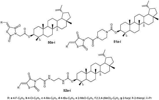 By modifying lupeol with ylidene derivatives of thiazolidinediones, long known for their antiproliferative properties [48], three groups of hybrids 5052 were obtained (Figure 17), among which compound 52i (IC50 4.40 µM) was found to be the most active in inhibiting the growth of HepG2 cells, 9.9 times more potent than the effect of the original lupanoid (IC50 = 43.62 µM) [49].