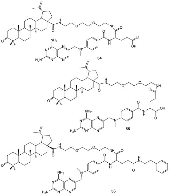 Recently, new MTX-BA hybrids 5456 containing a (tert-butoxycarbonylamino)-3,6-dioxa-8-octanamine (Boc-DOOA) linkage were synthesized (Figure 19). Their distribution in artificial 1,2-dipalmitoylphosphatidylcholine (DPPC) membranes was evaluated by differential scanning calorimetry. The ability of compounds 5456 to permeate cell membranes was tested using human colorectal adenocarcinoma (Caco-2) cells at a concentration of 10 μM [58].