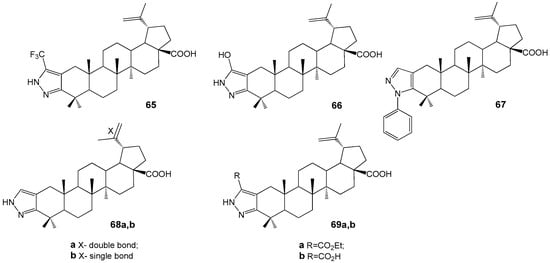 Pyrazole derivatives 68a,b (Figure 22) showed strong anti-inflammatory and potent inhibitory activity of osteoclastogenesis and bone resorption (100% at 10 µM) [69]. They were synthesized from betulonic acid via diketone formation and condensation with hydrazines, alongside hybrids 6569. Pyrazole-BA conjugate 68a demonstrated significant anti-inflammatory effects in a collagen-induced arthritis model [70].