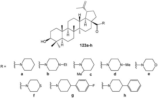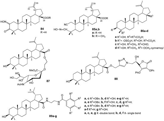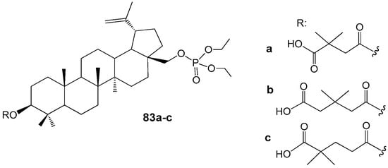 Conjugates of BA with gallic or caffeic acid 82ah (Figure 26) were studied as inhibitors of HIV-1 gp41 fusion core formation [92]. Several galloyl derivatives demonstrated activity approximately five times greater than that of BA, suggesting their potential as lead structures for the development of HIV-fusion/entry inhibitors.