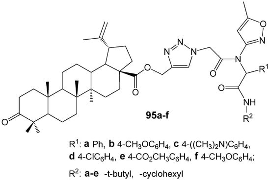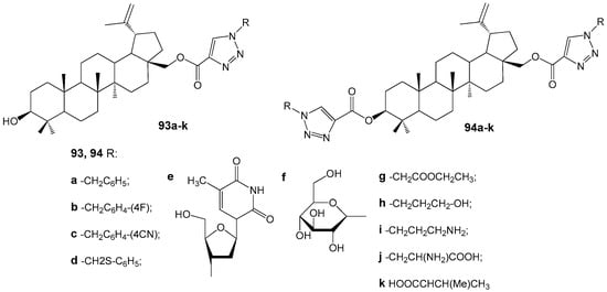 Xiong J. et al. linked BVM 72 to AZT using a short ester linker, resulting in the synthesis of 14 conjugates, nine of which demonstrated potent anti-HIV activity with EC50 values ranging from 40 to 98 nM in HIV-1 (NL4-3)-infected MT-4 cells (Figure 25). The most effective compound, 75 (EC50 = 0.040 µM), exhibited markedly greater inhibition of viral replication compared to the parent BVM (EC50 = 0.096 µM). In contrast, conjugates modified at the 3-OH group 76ac displayed reduced activity relative to compound 75 [88]. Additionally, BVM conjugated with AZT at the C-28 position of the lupane scaffold via click chemistry 77 and its propargylic ester precursor also showed substantial anti-HIV activity (EC50 values of 0.10 µM and 67 nM, respectively), comparable to that of AZT (EC50 = 0.10 µM) [89].