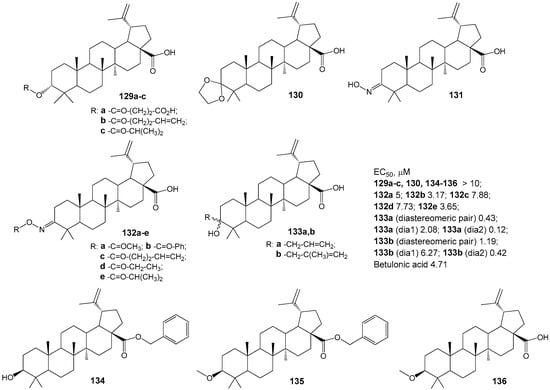 The development of effective antiviral agents represents a significant challenge in both medicinal chemistry and pharmacology. This complexity arises from viruses’ reliance on the host cell’s reproductive machinery for replication and their high mutation rates. According to the World Health Organization, some of the most prevalent and hazardous viral infections globally include rabies virus, HIV, hepatitis C virus (HCV), influenza A viruses (H5N1 and H7N9), coronaviruses (SARS-CoV, MERS-CoV, COVID-19), as well as tropical region viruses such as Ebola (EBOV), Marburg, Lassa, and Zika (ZIKV) [72,73,74,75,76]. The emergence of the COVID-19 pandemic, the spread of ZIKV throughout Central and South America, and outbreaks of EBOV in Africa have further driven the accelerated advancement of antiviral drug development. Plant metabolites are considered promising sources for the development of basic structures used in designing such agents. Between 1981 and 2014, more than 40% of antiviral drugs in clinical use were either natural products or derived from natural product prototypes [77]. Researchers have investigated lupanoids as molecular platforms for antiviral agent design following Fujioka et al.’s discovery that BA from the leaves and bark of Syzigium claviflorum displayed notable activity against HIV (EC50 = 1.4 µM) [78]. Additionally, pentacyclic triterpenoids have high lipophilicity, which enables these molecules to interact with viral capsids and potentially inhibit the entry of viral particles into host cells [79].