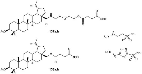Sulfamate derivatives of BA 3033 (Figure 10) were synthesized and evaluated for their antiproliferative activity against the tumor cell lines 518A2, FaDu, HT-29, MCF-7, A549, and SW1736. Compound 30 (EC50 = 6.7–10.1 µM) and the C-28-monosubstituted derivative 33 (IC50 = 4.87–9.94 µM) demonstrated significant cytotoxic effects on 518A2, 8505C, A2780, MCF-7, and A54 cell lines. Additionally, compound 33 exhibited potent inhibitory activity against carbonic anhydrase IX (Ki = 1.25 nM). The combination of antitumor activity with the inhibition of carbonic anhydrase improves the prognosis in breast cancer therapy [39,40]. Similar activity against several cell lines MCF-7, HS578T, MDA-MB-231, BT-20, T47D and SKBR of breast cancer (IC50 8–14 µM) in combination with inhibition of carbonic anhydrase IX and XII was also observed with BE sulfonamides 34a,b. These compounds are considered as promising lead structures for further pharmacological trials [41].