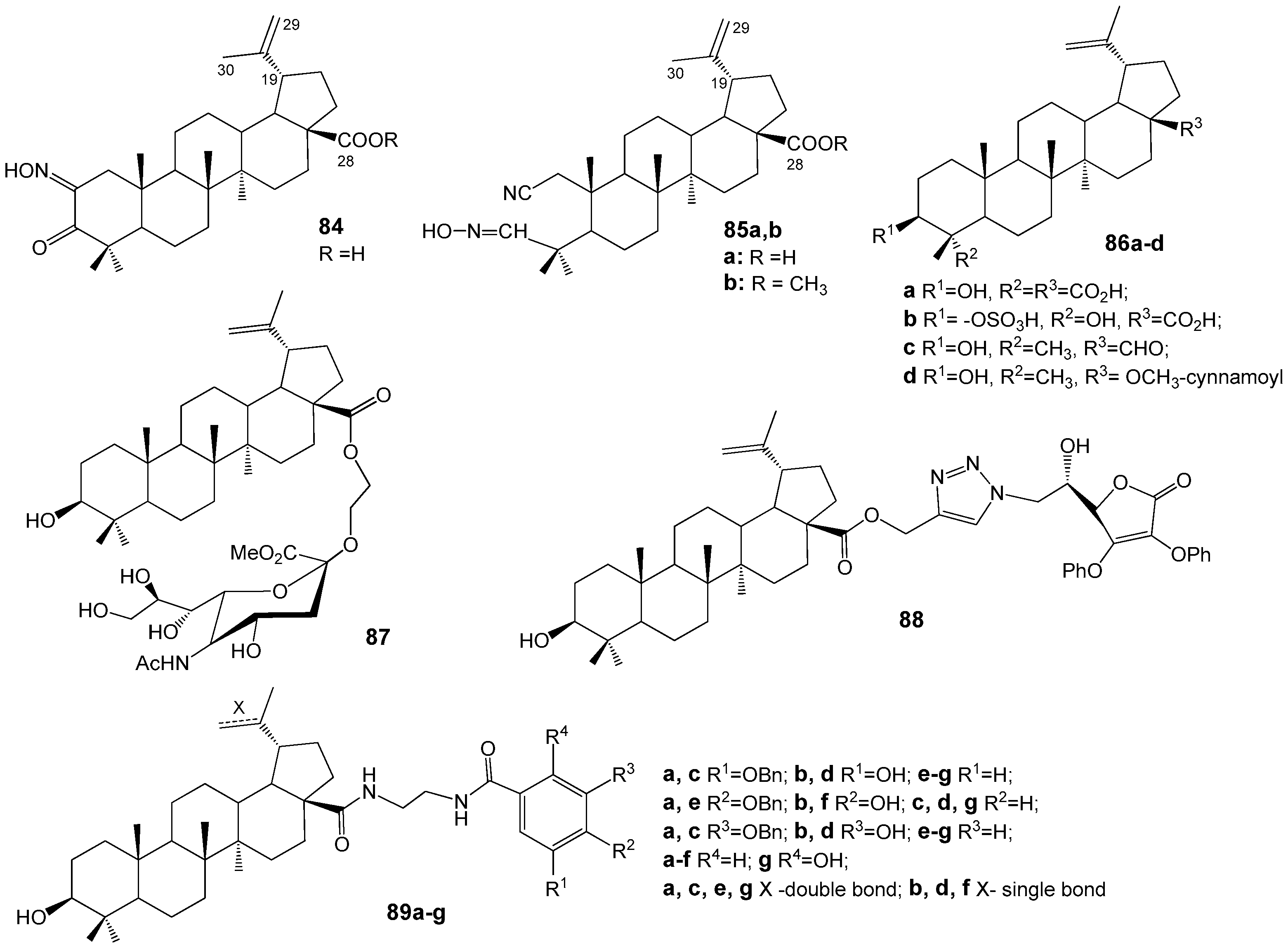 - Sousa, J.L.C.; Freire, C.S.R.; Silvestre, A.J.D.; Silva, A.M.S. Recent developments in the functionalization of betulinic acid and its natural analogues: A route to new bioactive compounds. Molecules 2019, 24, 355. [Google Scholar] [CrossRef] [PubMed]