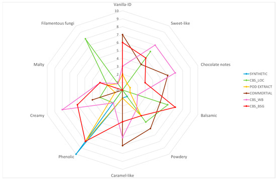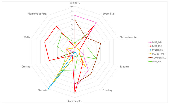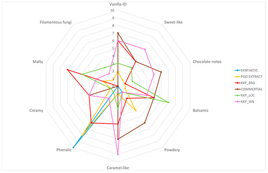 Similarly, as in the case of P. chrysosporium CBS246.84, vanillin obtained from LOC proved to be the least attractive in comparison to BSG and WB. Nevertheless, the sample showed a more attractive aroma profile compared to alcoholic vanilla pod extract (Figure 2).