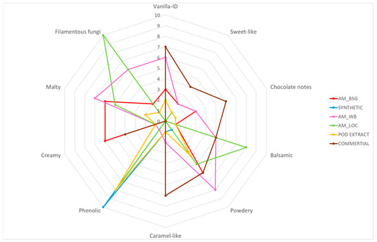 In the AM_LOC sample, a filamentous fungi note is very clearly perceptible; at the same time, panelists assessed the absence of vanilla notes, which is clearly visible in the radar chart presented below (Figure 4).