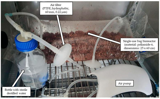 Cultures were performed in a single-use bag bioreactor. The bioreactor chamber (dimensions 25 × 60 cm) was constructed using a polyamide-6 sterilization foil sleeve. Using a heat sealer, 600 g of raw material was sealed inside the chamber, and openings were created for cable glands, into which silicone air supply tubes were inserted (Figure 5). After sterilization (121 °C, 15 min), the moisture content of raw material was adjusted to 60% (Phanerochaete chrysosporium CBS246.84, Fusarium culmorum MUT5855, Aspergillus sp. AM31) and 70% (Aspergillus flavus KKP3556) with modified Czapek’s medium (g/L—sucrose 5, sodium nitrate 3, ammonium chloride 1, magnesium sulfate 0.5, potassium chloride 0.5, ferrous sulfate 0.001), containing spores at OD600 0.3 (Phanerochaete chrysosporium CBS246.84, Fusarium culmorum MUT5855, Aspergillus sp. AM31) and 0.2 (Aspergillus flavus KKP3556), and incubated for 144 h at temperatures ranging from 25 °C (Fusarium culmorum MUT5855, Aspergillus sp. AM31, Aspergillus flavus KKP3556) to 30 °C (Phanerochaete chrysosporium CBS246.84). The strains were selected based on a screening conducted on 150 strains, and the conditions were established during the optimization of the process carried out in Erlenmeyer flasks [26]. To provide oxygen to the bioreactor, air sterilized by filtration (PTFE hydrophobic filters 60 mm, 0.22 µm) was introduced by aquarium air pumps through a silicone tube. Air-flow rate was measured at the outlet of the bioreactor using a rotameter (Kobold, model no. KFR-2114N0, Arnhem, The Netherlands); to adjust the air flow (1.75 NL/min), a choke valve was mounted on the air-flow line. To prevent the solid substrate from drying out, the air was humidified by passing it through a bottle containing sterile distilled water.