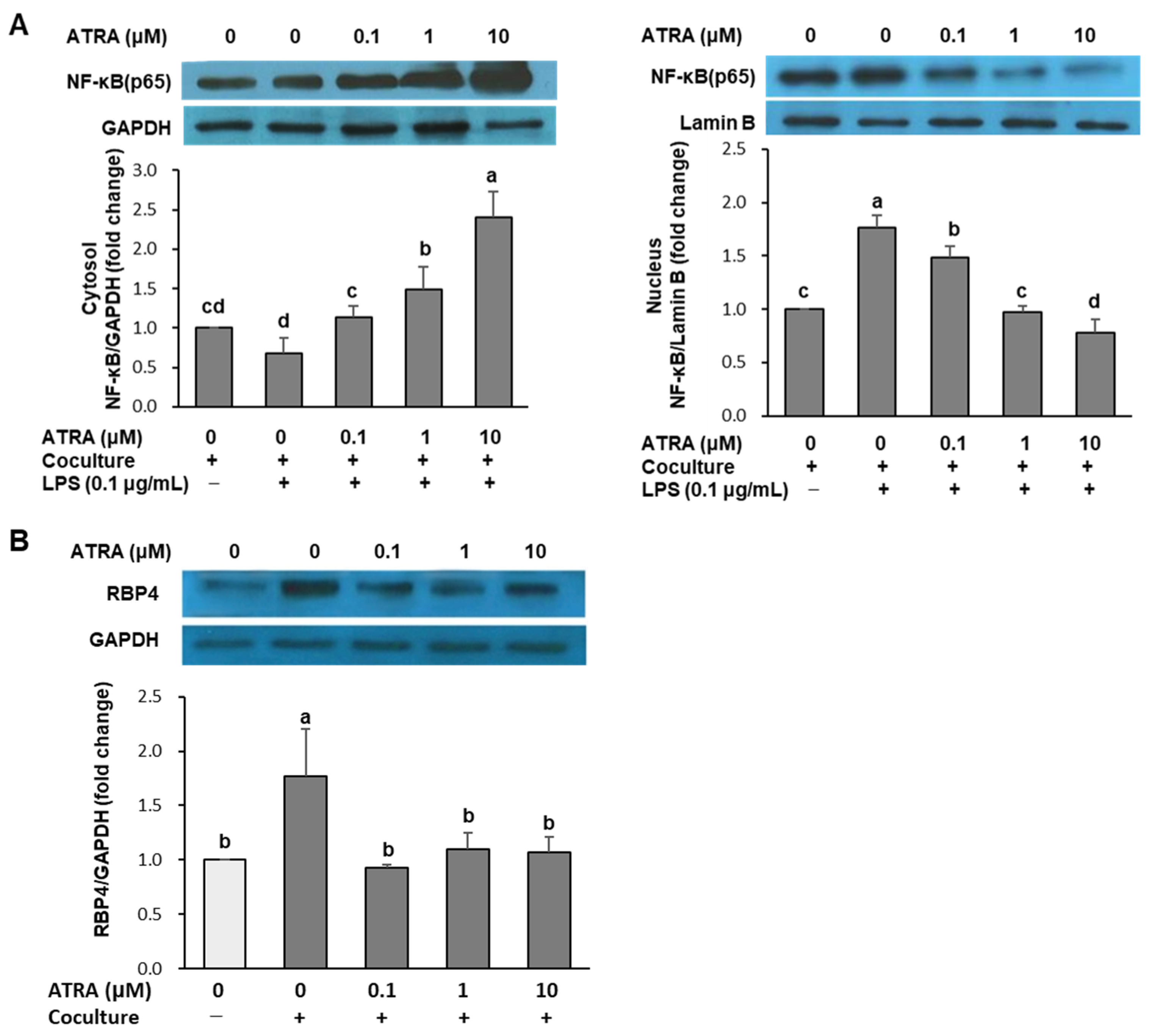 2.4. ATRA Limits NF-κB Activation and RBP4 Expression in Cocultured Adipocytes