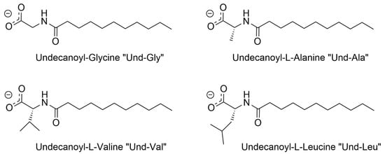 The AABSs were synthesized following previously published methods, whereby undecanoic acid was first coupled with N-hydroxysuccinimide (NHS) to form an undecanoyl-NHS ester [21,37]. The undecanoyl-NHS ester was then subjected to amide formation upon coupling with each respective amino acid (Section S1 of the Supplementary Materials). The AABSs were then directly obtained by filtration after having been precipitated from solution with the addition of HCl. The precipitate was washed several times with deionized water to ensure complete removal of HCl residues, then freeze dried. The purity of the AABSs compounds was then verified using 1H NMR spectroscopy (Section S2 of the Supplementary Materials).
