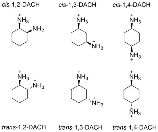 Structural representations of the cis- and trans- stereoisomers of 1,2-DACH, 1,3-DACH, and 1,4-DACH counterions. Fully protonated counterions are shown; however, the exact diamine charge will depend on the pH.