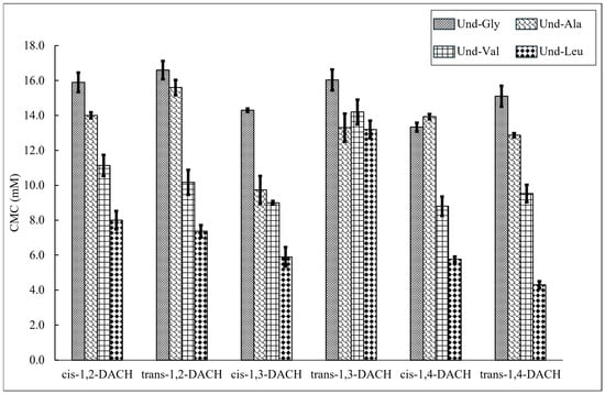 CMC values were determined by conductimetry for surfactants Und-Gly, Und-Ala, Und-Val, and Und-Leu with each of the counterions, cis-1,2-DACH, trans-1,2-DACH, cis-1,3-DACH, trans-1,3-DACH, cis-1,4-DACH and trans-1,4-DACH (Figure 3, Table 1). It was determined that the CMCs of the surfactants decrease with increases in the length of the amino acid side chain in the presence of most counterions. For example, for solutions containing cis-1,2-DACH, the CMC steadily decreased from 15.9 mM to 8.0 mM as the amino acid side chain length increased from Und-Gly to Und-Leu. This observation is likely due to the increased hydrophobic character associated with the larger amino acid side chains, which would promote micellization at lower concentrations to reduce unfavorable hydration interactions. Interestingly, this trend is not followed by the surfactant systems comprising trans-1,3-DACH. Rather, the CMCs for these systems ranged from 13.2 mM to 16.0 mM, with most values being statistically indistinguishable. This result suggests that trans-1,3-DACH binds to the micelles in such a way as to minimize the effect of varying headgroup hydrophobicity of each surfactant during micelle formation. Additionally, the CMC of Und-Gly in the presence of trans-1,4-DACH could not be measured at 25 °C due to its poor solubility and gel formation. Instead, a CMC of 15.1 mM was obtained, albeit at 60 °C. The insolubility of this system at 25 °C indicated that 1,4-DACH binds to Und-Gly in a way that promotes the self-assembly of larger aggregate morphologies at low temperatures. These assemblies can subsequently be disrupted at elevated temperatures. Overall, the data indicated that the structural parameters that influence CMC appear to be primarily driven by differences in the AABS side chains rather than counterion structure, with exceptions exhibited by both trans-1,3-DACH and trans-1,4-DACH.