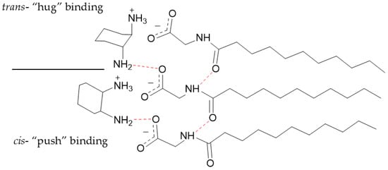 Graphical representation of the proposed binding of cis- and trans- DACH counterions to a micellar surface upon counterion condensation. Red dashed lines depict hydrogen bonding. Partially protonated counterions are shown; however, the exact diamine charge will depend on the pH.