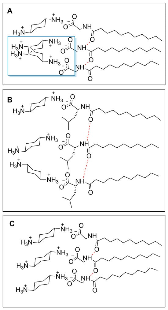 Structural representations of the proposed binding schema of Und-Gly with trans-1,4-DACH (A) the boxed region shows binding interference between counterions on adjacent surfactants, compared to Und-Leu with trans-1,4-DACH (B), and the organized alignment of Und-Gly with trans-1,4-DACH (C) leading to gel formation. Fully protonated counterions are shown; however, the exact diamine charge will depend on the pH.