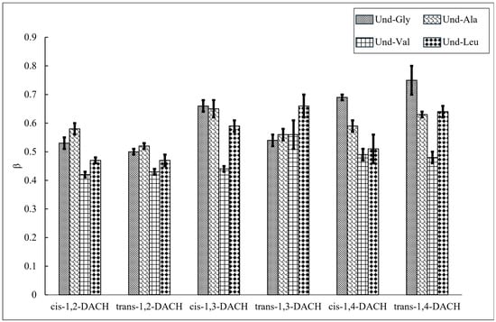 To investigate the efficacy of counterion condensation upon micelle formation, the degree of counterion binding (β) was calculated from conductimetry according to Equation (1) (Section 3.6) for each AABS and counterion pair (Figure 6, Table 3). For most DACH counterions, Und-Val consistently exhibited lower β values than the other AABSs. This observation is most pronounced when Und-Val was ion-paired with cis-1,3-DACH, for which β = 0.44, corresponding to 44% binding. AABSs Und-Ala and Und-Leu (Und-Val’s structural neighbors) exhibited 65% and 59% binding, respectively. This result indicates that the steric bulk presented by Und-Val’s amino acid side chain hinders DACH counterion binding in a manner that AABSs with similar side chains do not. Despite its steric bulk, Und-Leu does not exhibit a low degree of counterion binding. Its longer side chain leads to steric repulsion between AABS headgroups, giving the counterions greater access to the anionic carboxylate groups, thereby augmenting counterion binding. This selective reduction in Und-Val’s counterion binding (compared to Und-Ala and Und-Leu) agrees with previous findings, albeit with AABSs coupled with linear diammonium counterions [21].