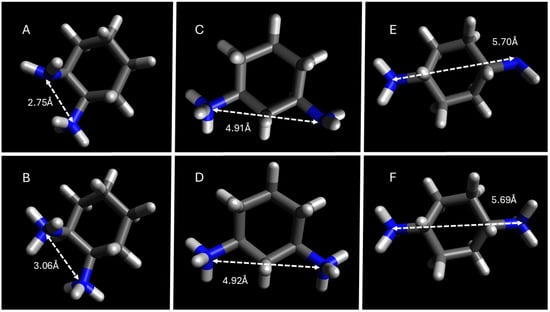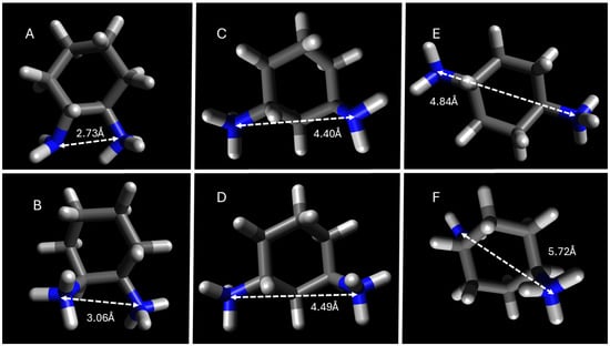 DFT geometry optimization of DACH counterions with the distance in angstroms between amines. (A). cis-1,2-DACH, (C). cis-1,3-DACH, (E). cis-1,4-DACH, all exhibiting a +1 charge, and (B). cis-1,2-DACH, (D). cis-1,3-DACH, and (F). cis-1,4-DACH all exhibiting a +2 charge.