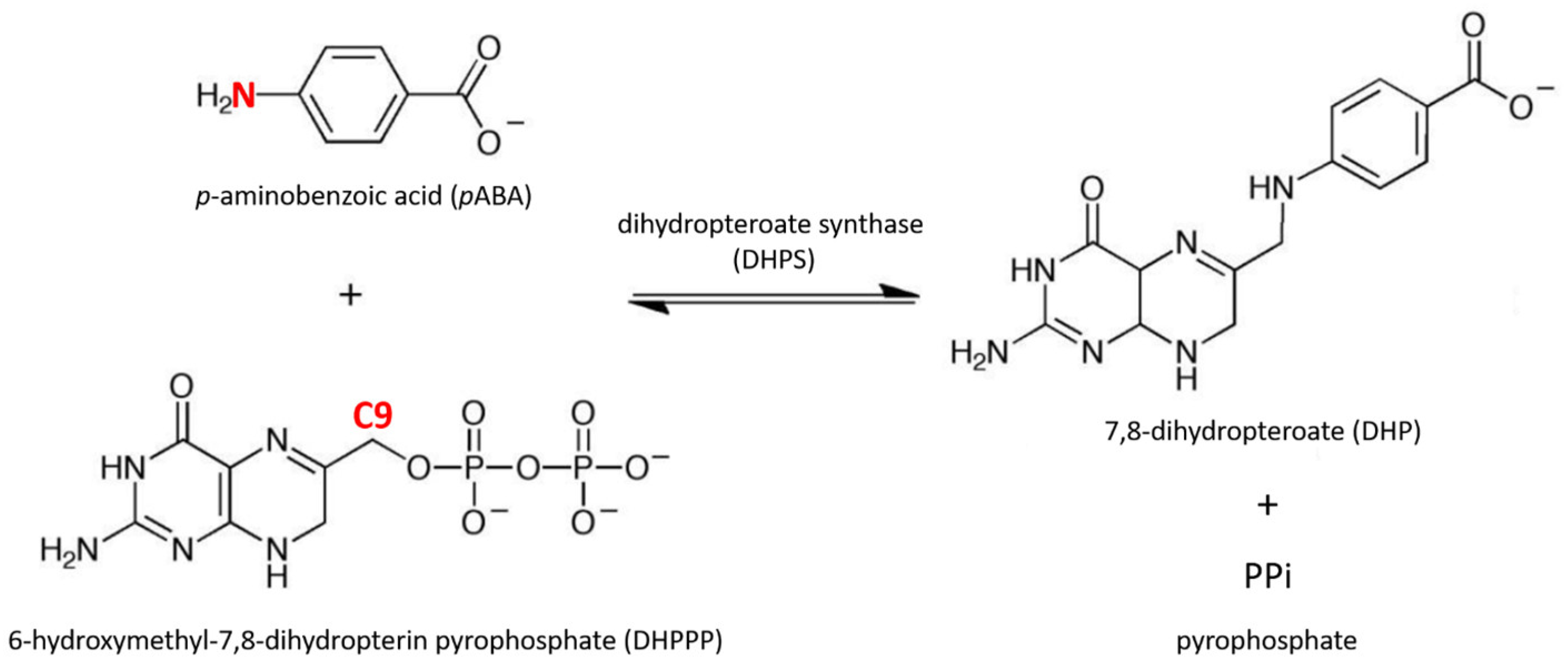 - Chitnumsub, P.; Jaruwat, A.; Talawanich, Y.; Noytanom, K.; Liwnaree, B.; Poen, S.; Yuthavong, Y. The Structure of Plasmodium falciparum Hydroxymethyldihydropterin Pyrophosphokinase-Dihydropteroate Synthase Reveals the Basis of Sulfa Resistance. FEBS J. 2020, 287, 3273–3297. [Google Scholar] [CrossRef]