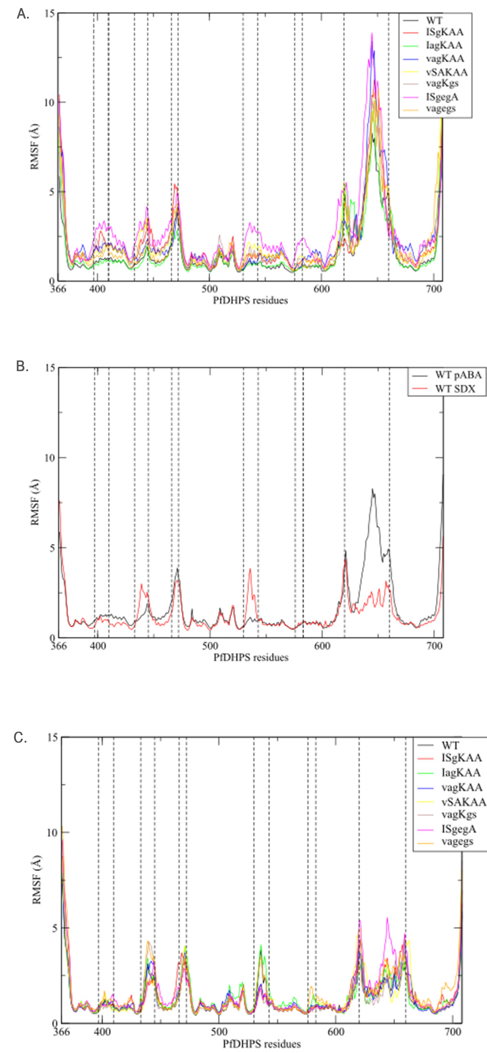 2.6. Conformational Analysis of PfDHPS Active Site in Complex with Sulfadoxine