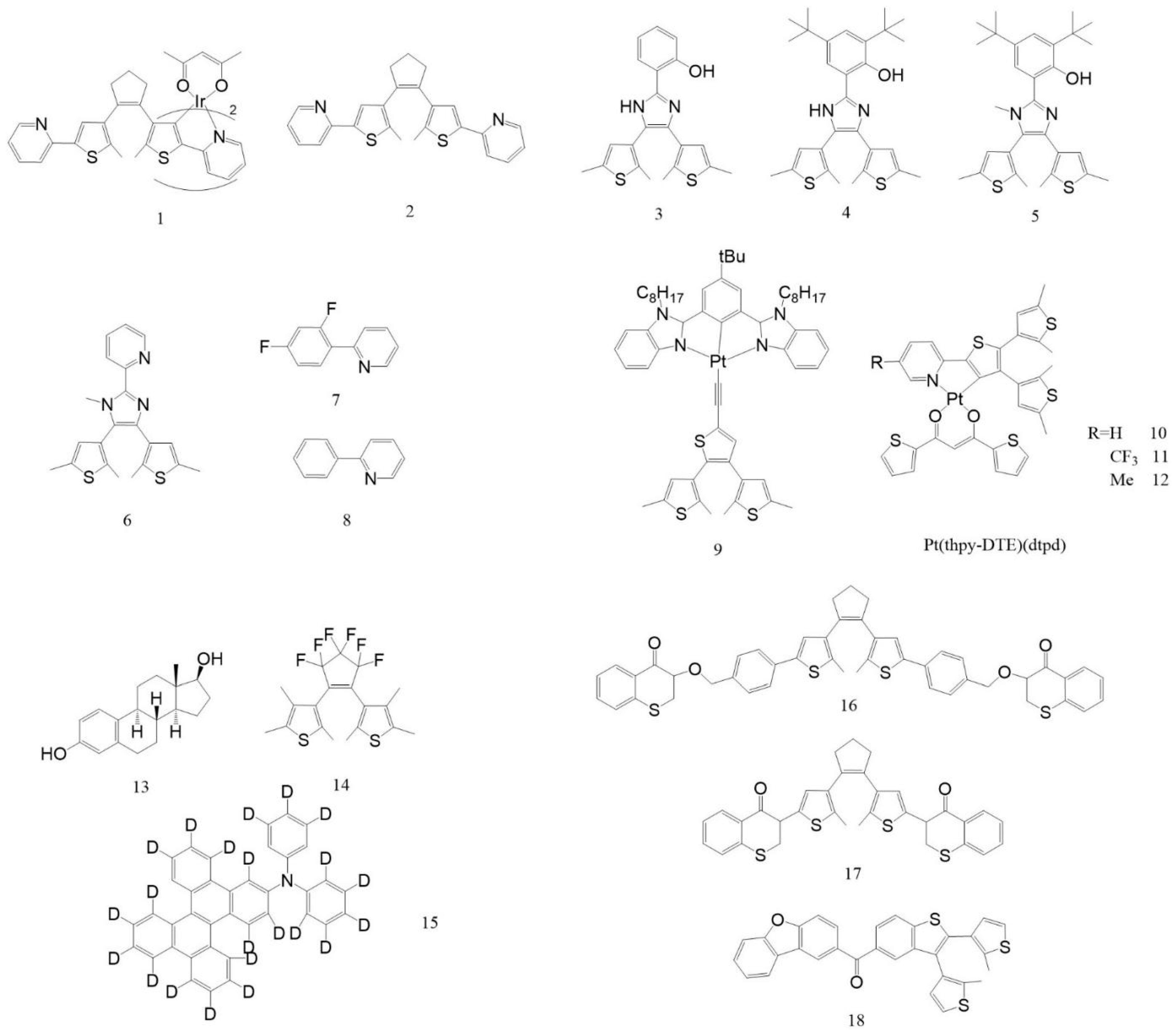 - Gong, D.-P.; Gao, T.-B.; Cao, D.-K.; Ward, M.D. Bisthienylethenes containing an imidazole bridge unit and their Ir(iii) complexes: Influence of substituent groups on photochromism and luminescence. RSC Adv. 2016, 6, 69677–69684. [Google Scholar] [CrossRef]