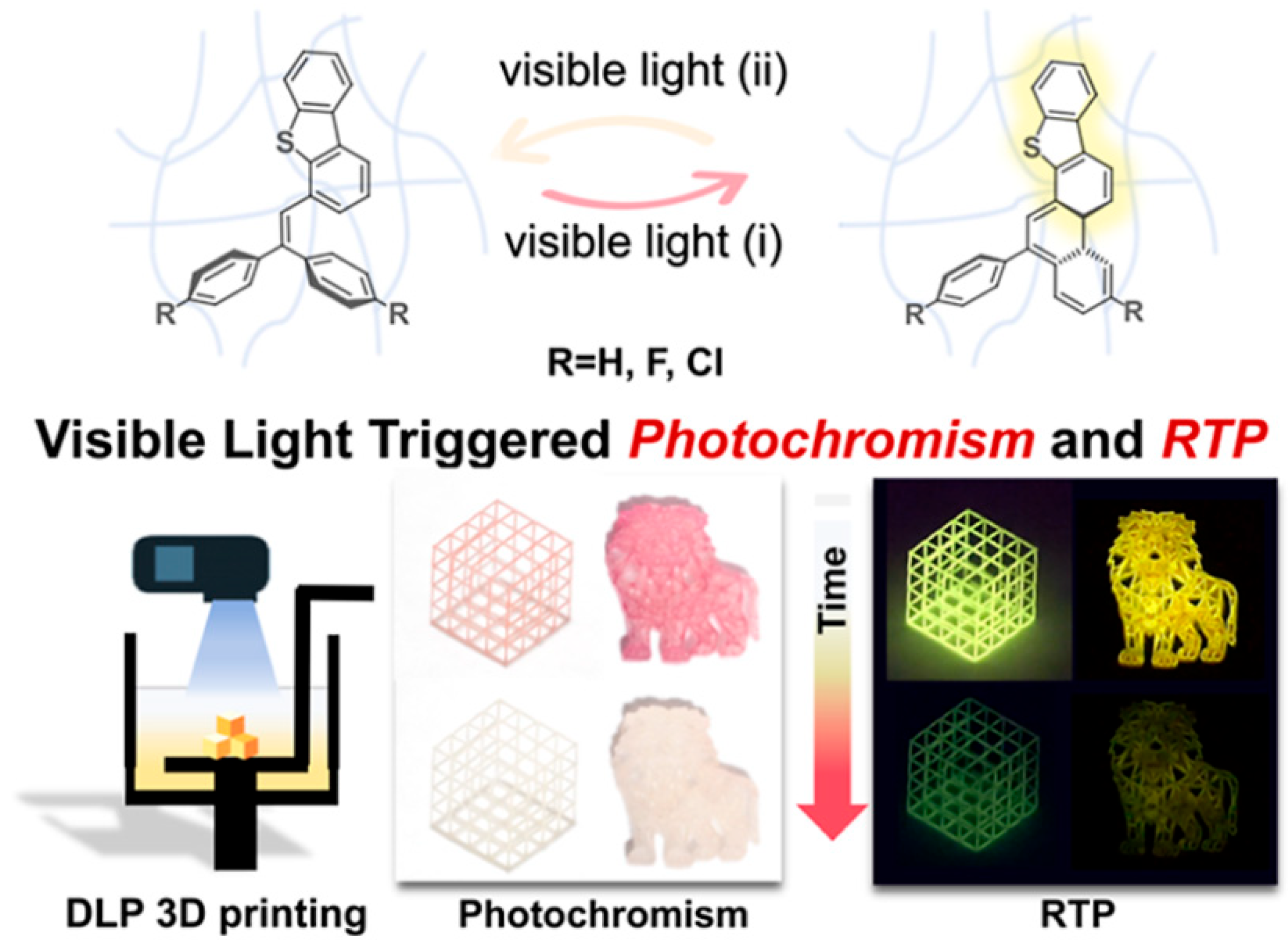 - Xiao, Y.; Li, J.; Song, Z.; Liao, J.; Shen, M.; Yu, T.; Huang, W. 3D Printable Materials with Visible Light Triggered Photochromism and Room Temperature Phosphorescence. J. Am. Chem. Soc. 2025, 147, 20372–20380. [Google Scholar] [CrossRef] [PubMed]