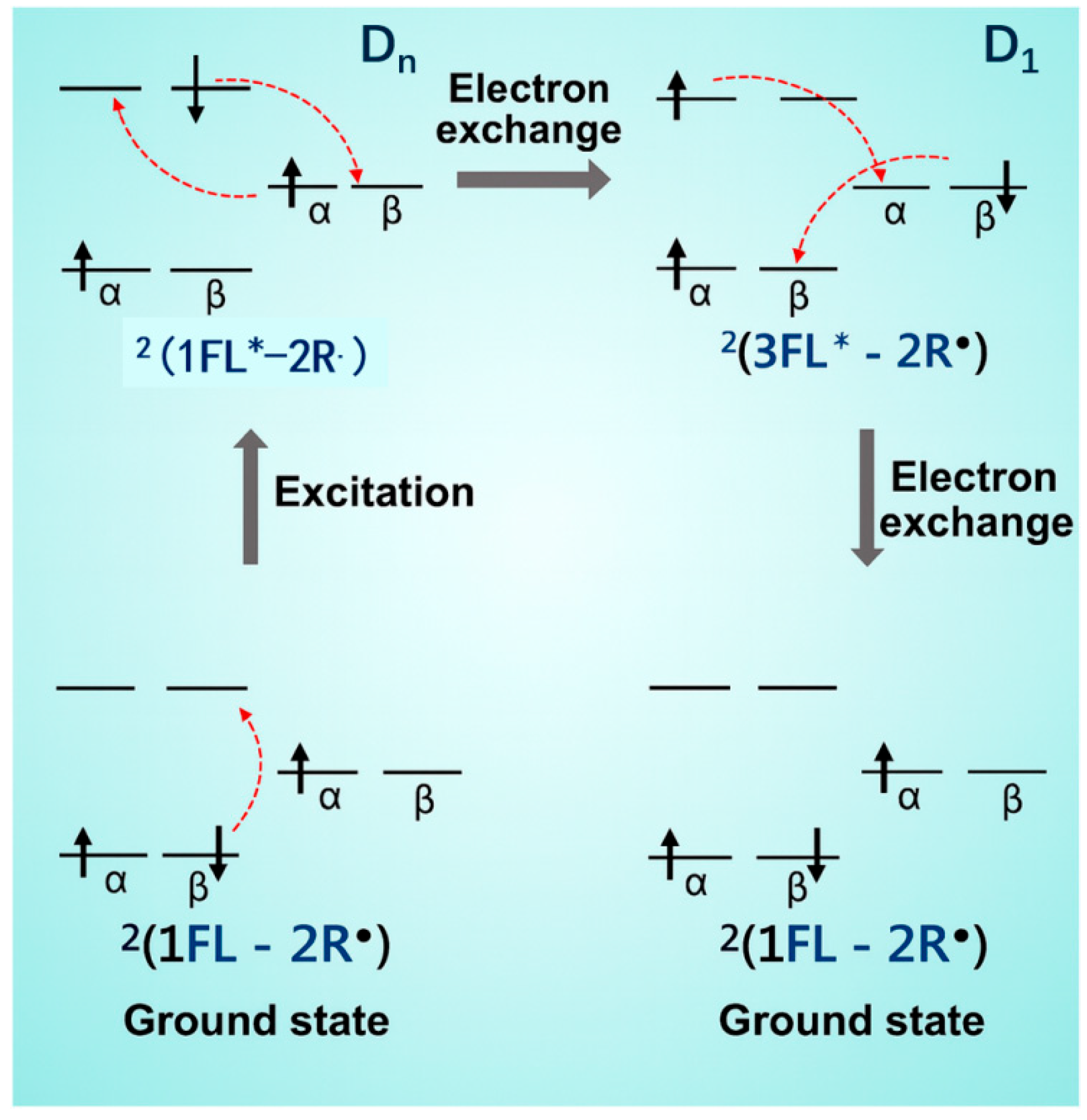 - Organic ligands bearing electron donor/acceptor groups undergo photoinduced electron transfer (PIET) to generate radicals [62,63,64,65,66]. Radical formation induces distinct color changes and significantly alters emission behaviors, often leading to exciton transfer or quenching. These processes regulate fluorescence or phosphorescence intensity and wavelength, and the reversible radical generation can be controlled by light or heat, typically validated by electron paramagnetic resonance (EPR). Such radical-mediated systems are particularly promising for light-controlled encryption and signal modulation.