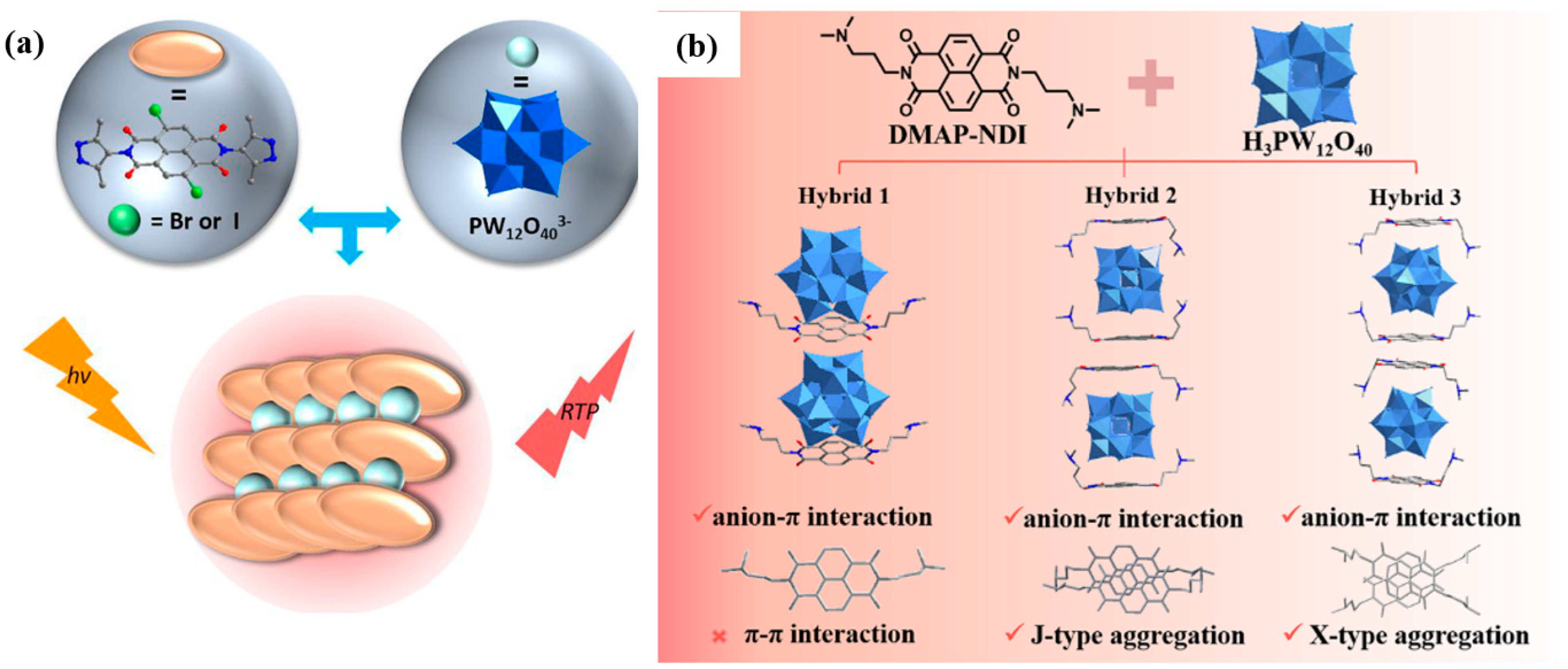 - Wu, X.-Y.; Zhang, H.-L.; Wang, S.-S.; Wu, W.; Lin, L.; Jiang, X.-Y.; Lu, C.-Z. Polyoxometalate-based room-temperature phosphorescent materials induced by anion–π interactions. Dalton Trans. 2020, 49, 3408–3412. [Google Scholar] [CrossRef]