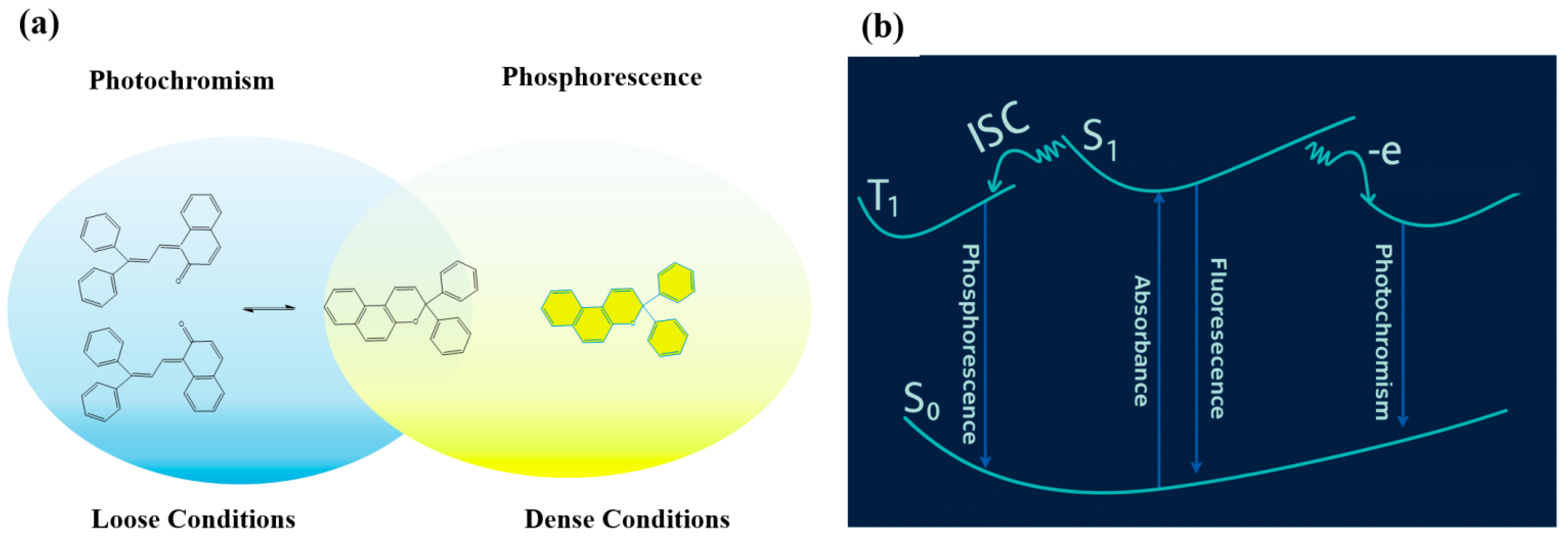 - Wang, J.; Yang, Y.; Zhang, L.; Li, Z. Engineering Organic Photochromism with Photoactivated Phosphorescence: Multifunctional Smart Devices and Enhanced Four-Channel Data Storage. Adv. Mater. 2025, 37, 2503074. [Google Scholar] [CrossRef]