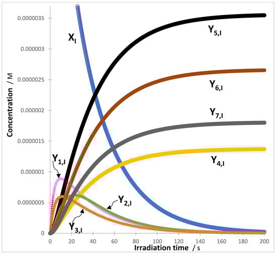 Mauser and co-authors have proposed mathematical solutions for the parallel reactions system using a Jacobi matrix method [49]. The method works well when reactions are modeled as mono-exponential patterns, but the cases of combined non-linear photochemical reactions’ rate-laws were not described.