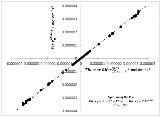 Accordingly, it is useful to consider the initial reaction rate () as a metric. This quantity is the only one that can directly be calculated by both the numerical method, , (the rate-constant being inaccessible by this means), and from the fitting parameters (Equations (8) and (10)), irrespective of the identifiability of the fitting parameters [53,54,55] (i.e., a unique value of is calculated from Equation (8) (or Equation (10)), whatever the set of the values of the fitting parameters, as long as Equation (7) (or Equation (9)) do fit well with the corresponding trace). Such values can also be compared to the ones () theoretically obtained from Equations (5) and (6) at the initial time. The coefficients used to calculate theoretical values by Equations (5) and (6), are those which have originally fed the RK-calculation of the multi-component system at hand.