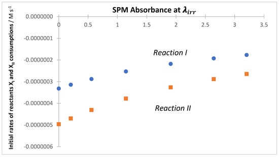 A progressive decrease in both initial rates values of the individual reactions of the binary mixture ( and , as given in Scheme 2) with increasing SPM absorbance at wavelength () of the monochromatic irradiation.