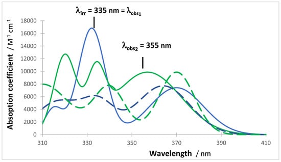 Absorption spectra ( units) of the reactants (blue) and products (green) of Reaction I (plain lines) and Reaction II (discontinued lines). Irradiation and observation wavelengths are indicated.