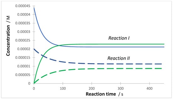 Concentration kinetic traces of the reactants (blue) and products (green) of Reaction I (plain lines) and Reaction II (discontinued lines). The initial concentrations are and .