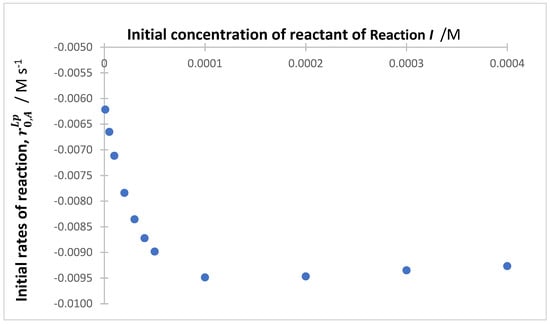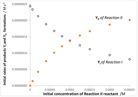 Evolution of the initial rate values of the formation of products (circles) and (dots) with an increasing initial concentration of () while is invariant. isolated reaction in the presence of SPMs (Figure 5). Reaction II, hence, seems to somewhat act as if it was an SPM for Reaction I in the mixture. The initial rates of the products have an opposite sign to those of the reactants, as and .