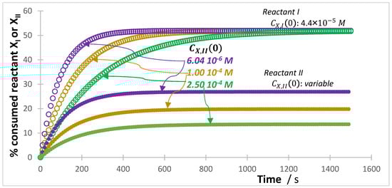 Each of the traces of the four reactants and products were fitted by the same Equation (7) (that were also used to fit their traces when obtained for single reactions, i.e., each individual reaction, not in a mixture). Hence, the overall pattern of each species’ kinetic trace was not affected by varying the initial concentration of one reactant of the mixture. The good fittings of the traces of the mixtures were indicated by similar quality of the assessing criteria ( and ) to those characterizing the single reactions (see Supplementary Information, Section S3a).