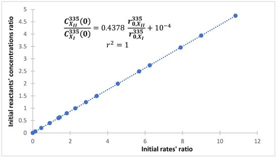 Effectively, the multi-reaction systems simulated in the present study provide good evidence (Figure 2) for the correspondence of these three values of the initial rates of the reactants () and their immediate photoproducts ( and , according to Scheme 1). The linear trend is characterized by both correlation coefficient and gradient, almost equal to unity, and a very small value of the intercept. The maximum percentage error value recorded between , , and does not exceed 5%.