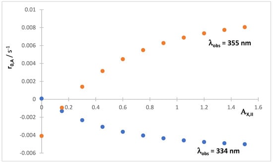 The validity of Equation (2) imposes that absorbances of the individual species in the reactor, that absorb at (), each have a value that falls within the linearity range of the corresponding species’ calibration graph (it was suggested [53,55] that this condition should in principle be satisfied if the value of does not exceed the value 0.5 throughout the reaction time).