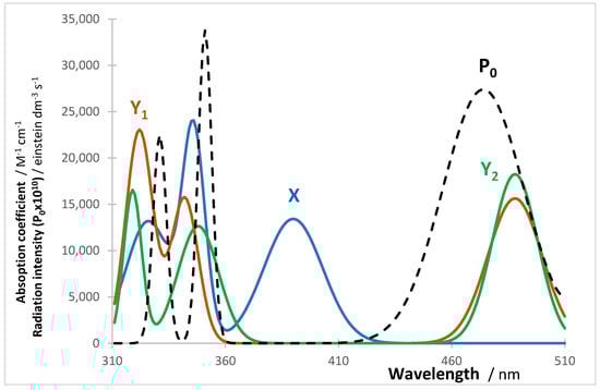 Therefore, intrinsic features (i.e., absorption coefficients and photochemical quantum yields and their variations with wavelength) are supposed to be known for all species of each individual reaction making up the mixtures of interest to the present study (obtained from the elucidation method). The extrinsic features, controlled by the experimentalist, are also supposedly known (these include the initial concentrations of the reactants, , the wavelength of the monochromatic beam at which the sample is exposed, , the incident radiation intensity at every , , the optical path length of the excitation beam within the sample, , the optical path length of the monitoring light from the spectrophotometer, , and both the irradiated area, , and volume, , of the sample).