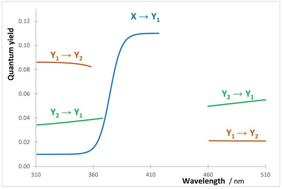 Running several independent reactions simultaneously can have several potential benefits. In green chemistry, this method might be envisaged to allow saving organic solvents, time, and energy in producing a set of end-products in a one-pot process [12,13]. There is also a merit to such photochemistry for industrial processes, which are currently an intensive subject of research, which otherwise has excellent perspectives for future developments in circular economy [14]. A similar endeavor is prospected for environmental issues as wastewater treatment [15], photocatalysis strategies [16,17,18], and soft matter materials [19]. Recently, a combination of photochromic molecules was employed as part of a single formulation [20], and such combinations make part of some commercially available photochromic ophthalmic lenses [21]. Other examples are found in photocatalytic degradation of two or more species [22], in synthetic photochemistry involving reagents coexisting with the main molecular reactive system of interest [23,24], such as molecular motors [25], nanosystems [26], photoresponsive supramolecular chemistry [27], photodegradation of food products [28], and in a variety of technologies using light-responsive soft matter [29]. Nonetheless, the instances of systems involving more than one photoreactive species extend the non-exhaustive list of cases reported here.