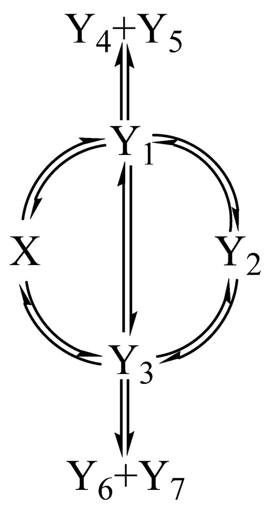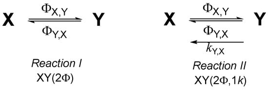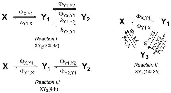The reactions selected for the mixtures belong to the -shaped mechanism (Scheme 1) encompassing eight species that may be interconnected by up to 28 reaction-steps [53,55]. As such, Scheme 1 covers a large set of the known photoreactions’ mechanisms. The reactions are labeled as (see definitions in Section 2.4).