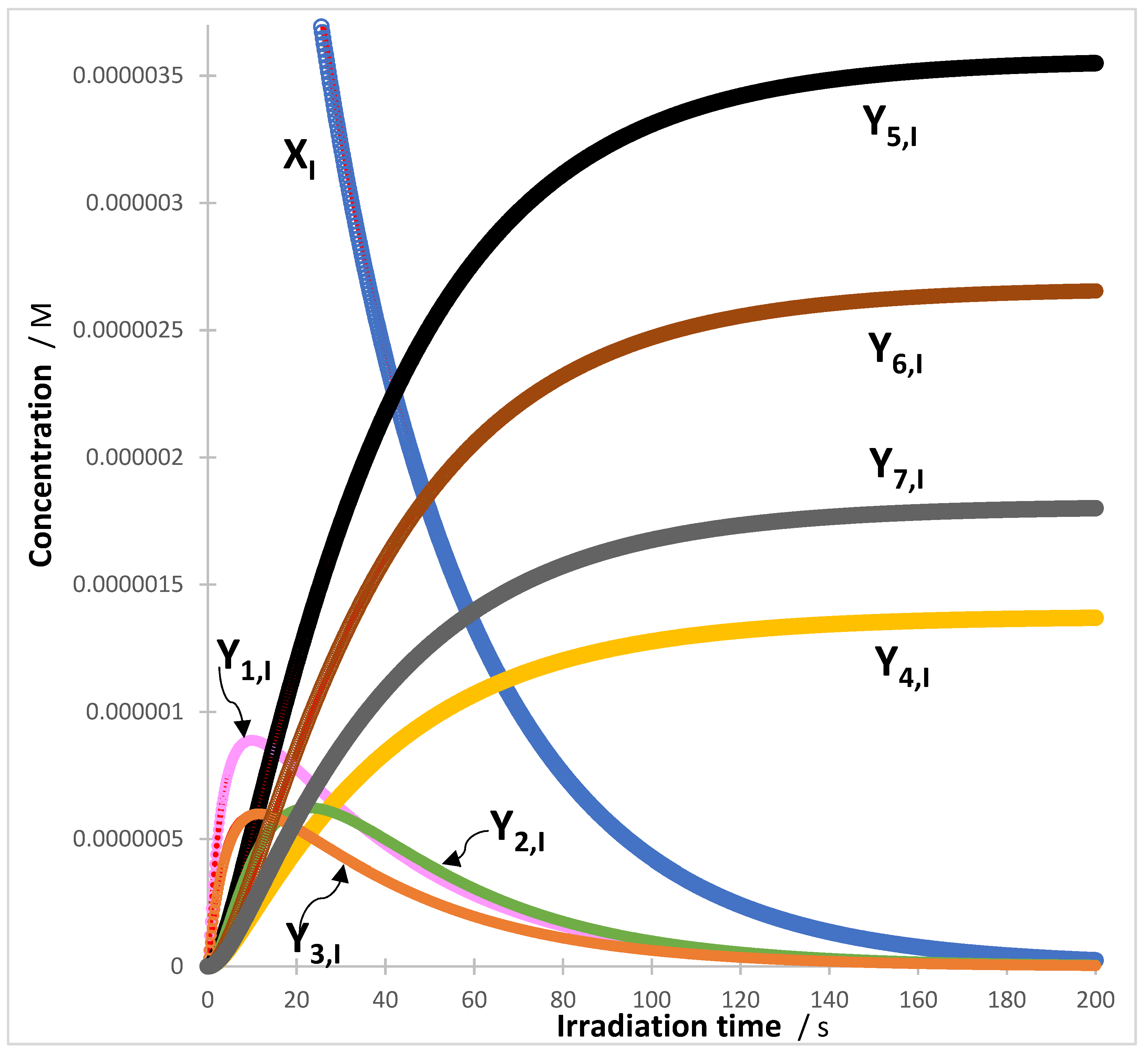 - Maafi, M.; Maafi, W. Modelling and elucidation of the kinetics of multiple consecutive photoreactions AB4(4Φ) with Φ-order kinetics. Application to the photodegradation of ribofavin. J. Pharm. Sci. 2016, 105, 3537–3548. [Google Scholar] [CrossRef]