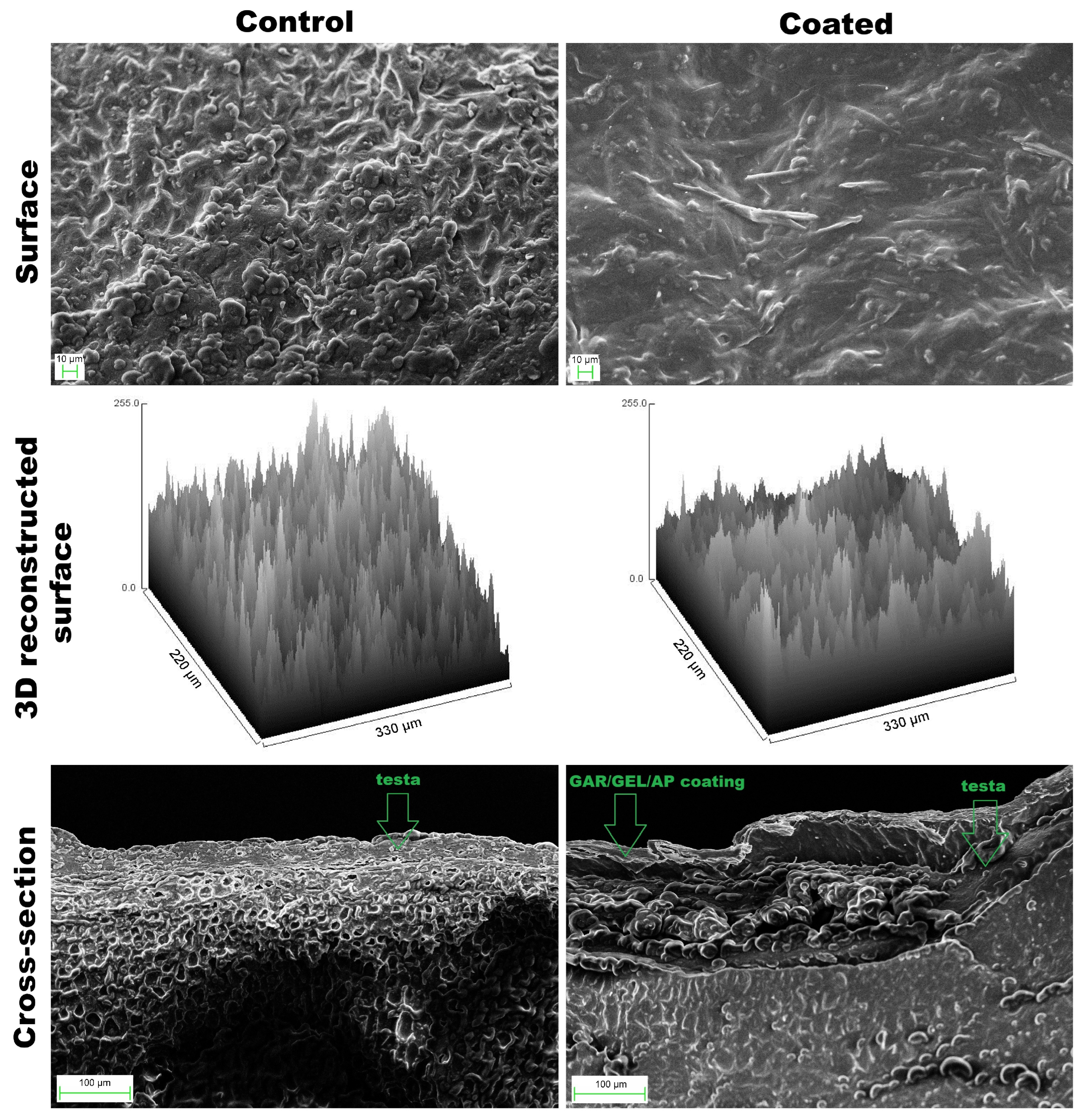 - Gull, A.; Masoodi, F.A.; Masoodi, L.; Gani, A.; Muzaffar, S. Effect of sodium alginate coatings enriched with α-tocopherol on quality of fresh walnut kernels. Food Chem. Adv. 2023, 2, 100169. [Google Scholar] [CrossRef]