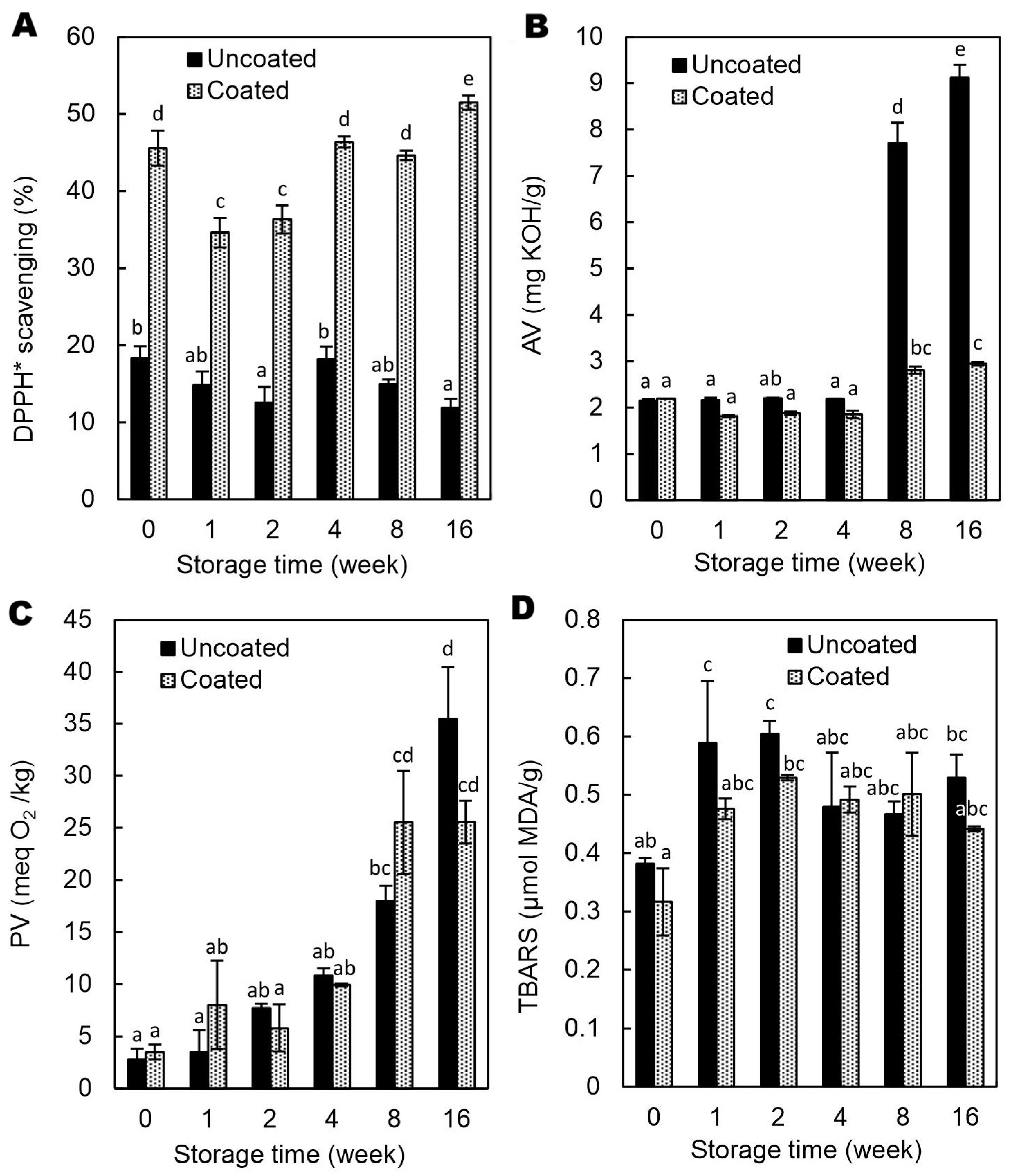 2.4. Antiradical Activity, Acid Value (AV), Peroxide Value (PV), and Thiobarbituric Acid Reactive Substances (TBARS) Concentration