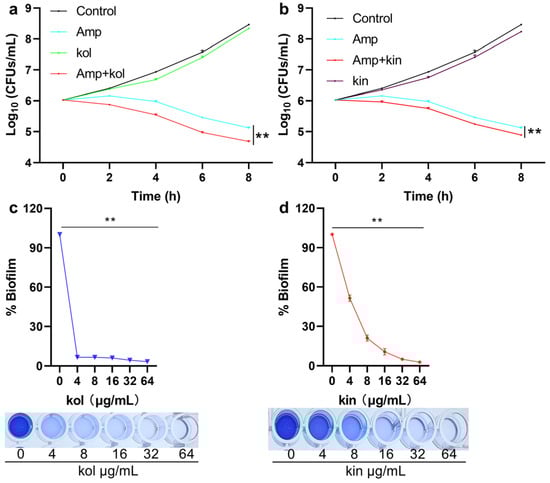 2.1.6. Kol and Kin Enhanced the Bactericidal Activity of Amp and Inhibited the Biofilm Formation of S. aureus USA300