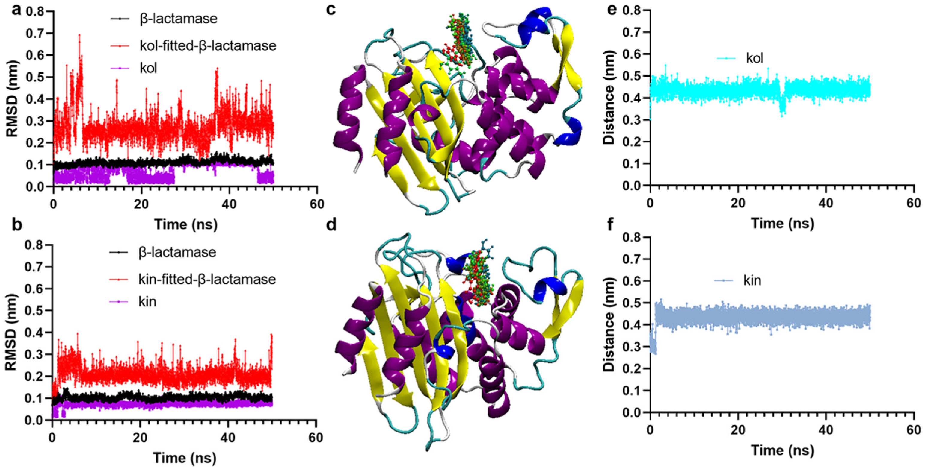 Figure 2. Kol and kin maintain stable binding with β-lactamase. (a,b) RMSD values of β-lactamase with kol or kin during molecular dynamics simulations. (c,d) The positions of kol or kin on the β-lactamase at different simulation times. Protein was shown as NewCartoon and colored by secondary structure, and kol and kin were shown as CPK and colored by timesteps. (e,f) The distance between β-lactamase and kol or kin against the simulation time.