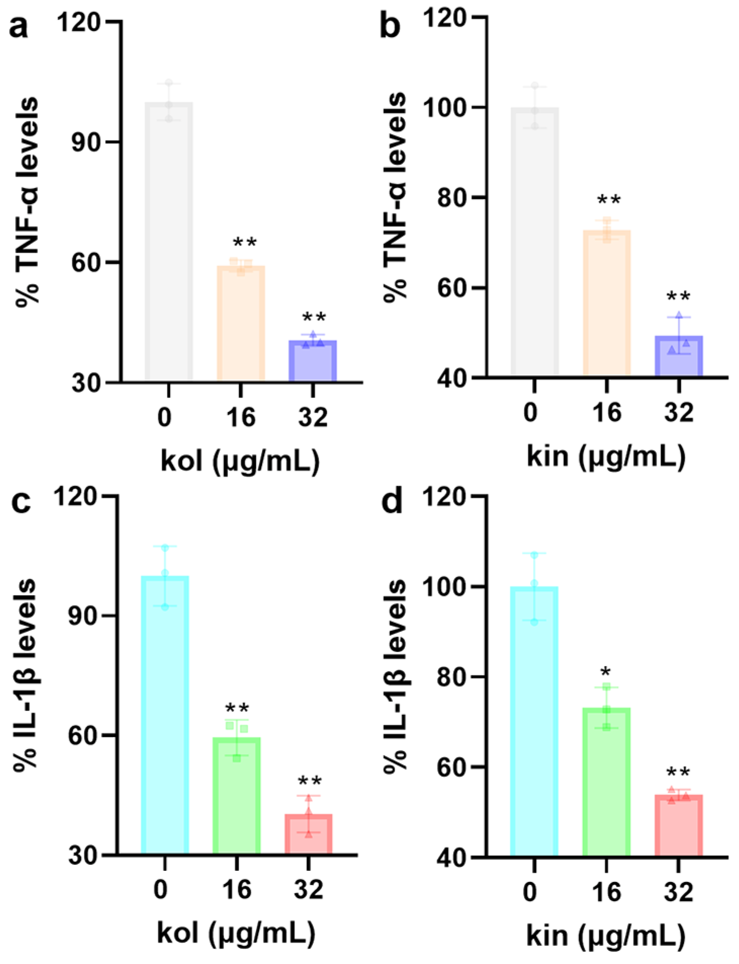 The levels of TNF-α and IL−1β reached 1247.69 pg/mL and 597.83 pg/mL when J774 cells were treated with S. aureus USA300, which indicates the pathogen triggers cellular inflammatory response. Meanwhile, when J774 cells were treated with S. aureus USA300 and 32 µg/mL kol or kin, the levels of TNF-α decreased to 40.62% and 49.43% (Figure 7a,b), and the levels of IL-1β decreased to 40.36% and 52.69% (Figure 7c,d). These results suggest that kol or kin could inhibit the inflammatory response mediated by S. aureus.