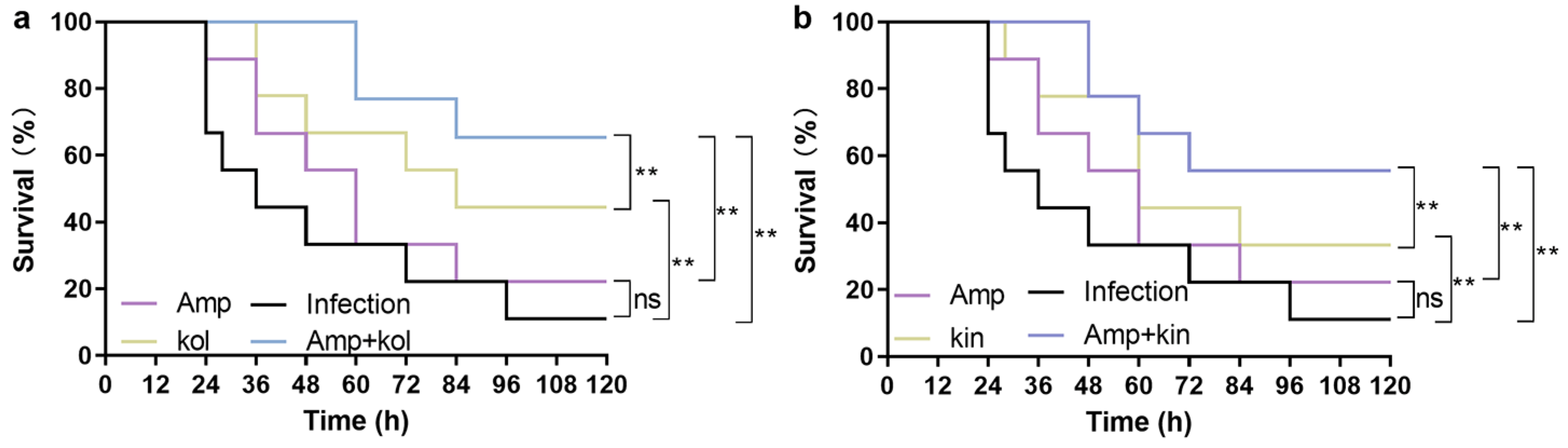 Figure 8. Kol or kin alone or cooperated with Amp improved the survival of S. aureus USA300 infected G. mellonella. (a,b) The survival of G. mellonella from different treatment groups. G. mellonella was treated with S. aureus USA300 and Amp, kol, kin alone, or their combination. The infected G. mellonella that received equal volume solvent treatment was defined as the infection group. Survival of G. mellonella under different treatment groups was statistically analyzed. Nine G. mellonella were arranged in each group, ns = not significant; ** p ≤ 0.01.