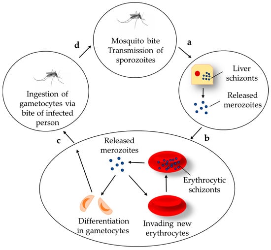 Life cycle of the Plasmodium: the inoculated sporozoites infect liver cells and mature into schizonts (a), the released merozoites infect the erythrocytes (b), circulation of the gametocytes in the blood stream and infecting mosquitos (c), formation of zygote in the gut and sporozoites in the salivary glands of the infected mosquito (d).