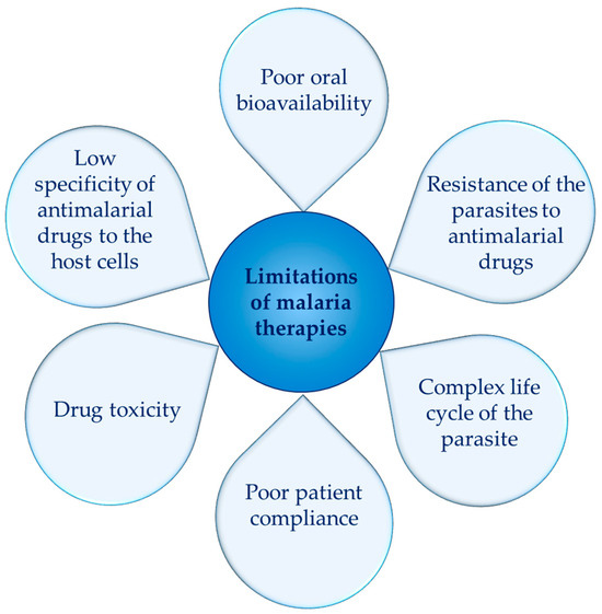 The current antimalarial therapies are characterized by a number of limitations (Figure 2). Many of the existing drugs exhibit poor solubility, which results in low absorption and poor bioavailability. Furthermore, some malaria parasites have developed resistance to the commonly used antimalarial drugs. However, the administration of higher doses would increase toxicity, which for some groups of antimalarial drugs is inherently high. Drug toxicity is also related to the lack of selectivity of antimalarial drugs to the infected erythrocytes. Therefore, the discovery of new approaches to overcome these limitations has become urgent. Among the most researched strategies are the synthesis of new antimalarial molecules (1) and the development of innovative drug delivery systems capable of improving the bioavailability and pharmacokinetics of the existing drugs (2).